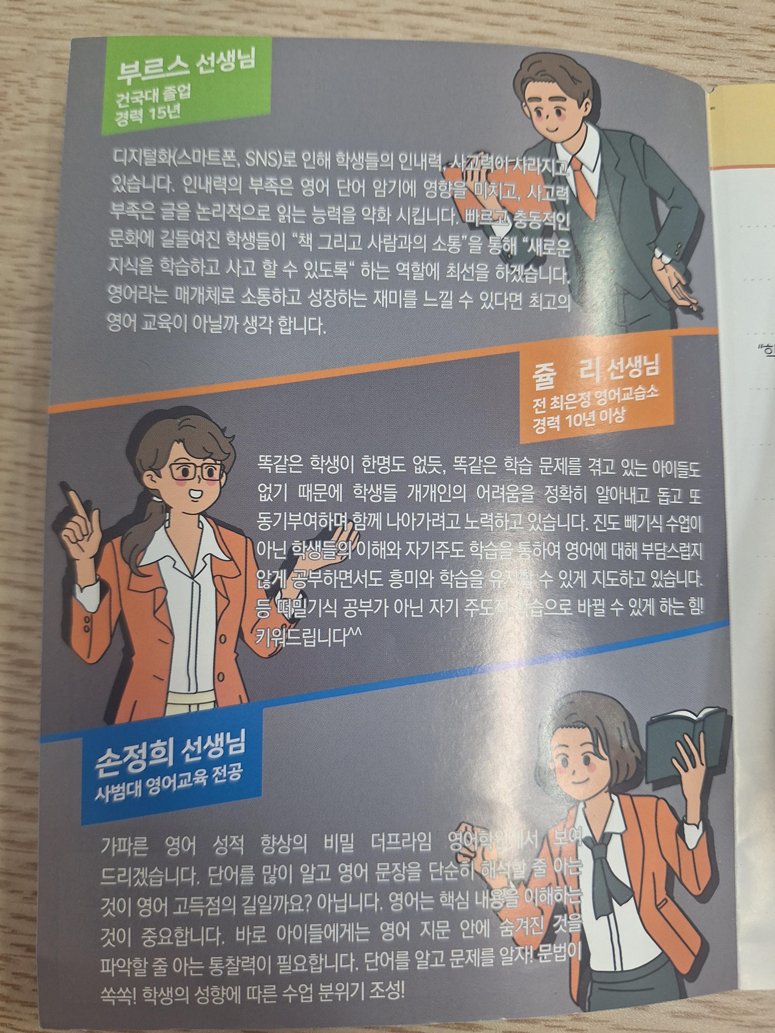 언급한 세가지 요소는 어떻게 보면 기본적으로 갖춰야 할 요소이지만, 세가지를 동시에 충족시키기는 생각보다 어려운 부분이 있습니다. 하지만, 저희 선생님들은 모두 프로페셔널한 선생님들이기 때문에 세가지 요소를 모두 잘 충족시키고 생각합니다. 앞으로도 학생의 입장에서 어려움을 공감하고, 학습적, 인성적으로 학생을 좀 더 발전시킬 수 있도록 노력해 나가도록 하겠습니다.